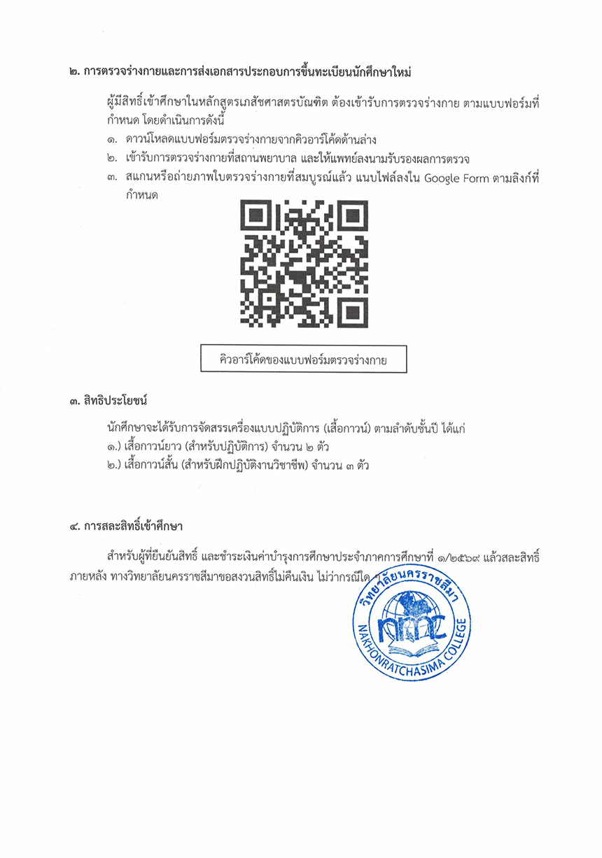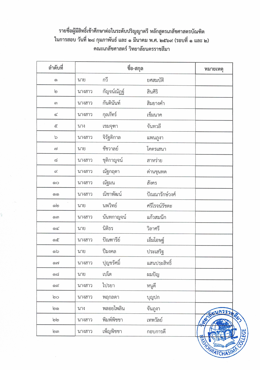: ประกาศรายชื่อผู้มีสิทธิ์เข้าศึกษาระดับปริญญาตรี หลักสูตรเภสัชศาสตรบัณฑิต ปีการศึกษา 2569 (รอบที่ 1 และ รอบที่ 2)