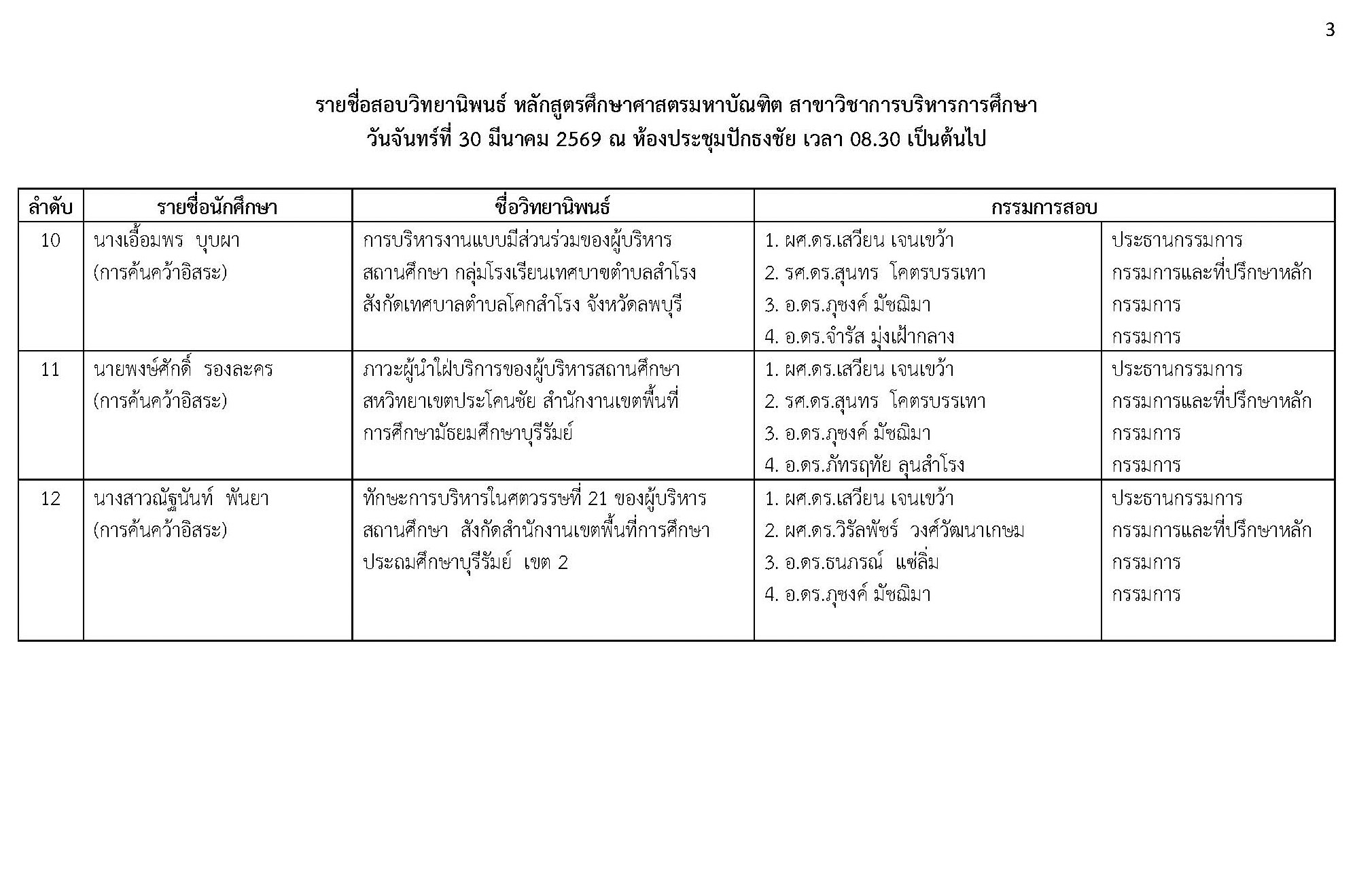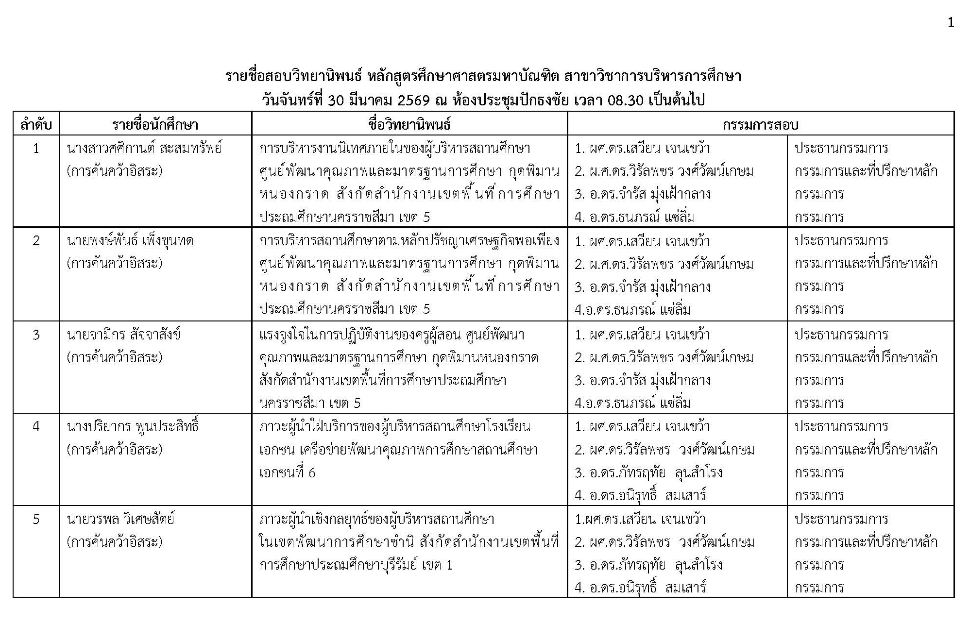 หัวข้อ : ประกาศรายชื่อสอบวิทยานิพนธ์ หลักสูตรศึกษาศาสตรมหาบัณฑิต สาชาวิชาการบริหารการศึกษา วันจันทร์ที่ 30 มีนาคม 2569 ณ ห้องประชุมปักธงชัย